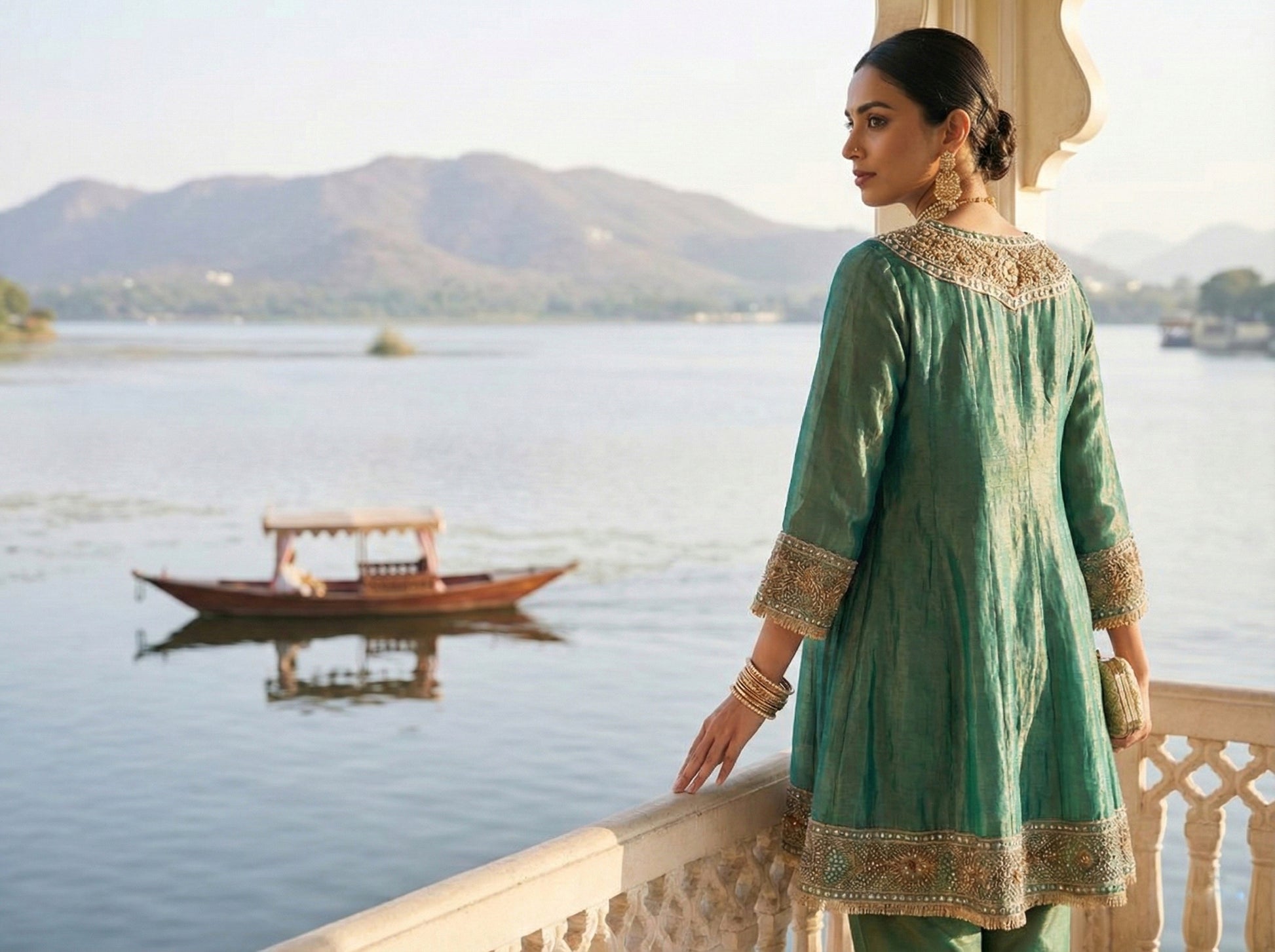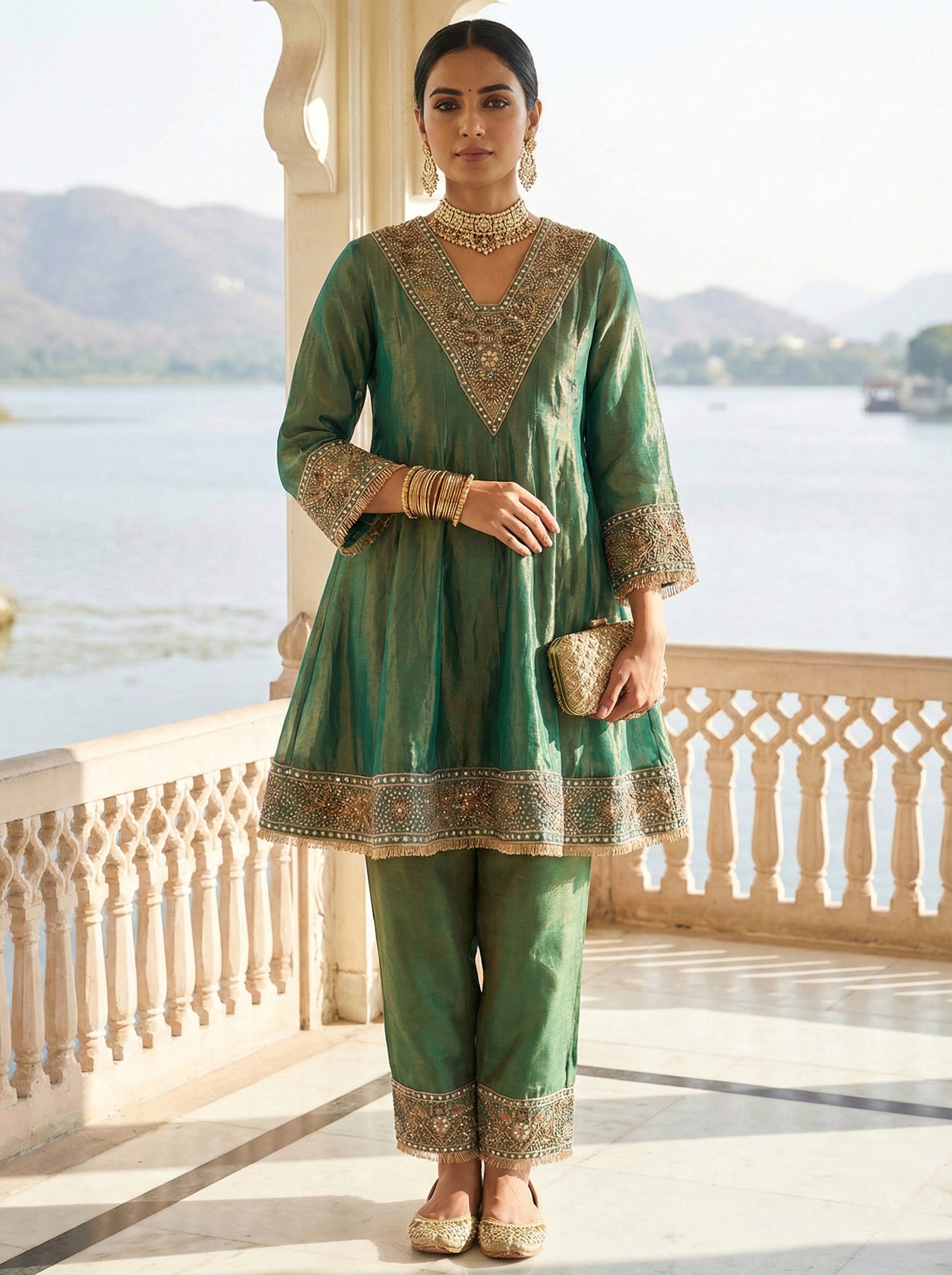 Crafted in luminous teal silk tissue, the flowing Anarkali is lavishly hand-embroidered with intricate zardozi, wherAparnae dabka, nakshi, resham, beads, sequins, and zari come together in a symphony of opulence.