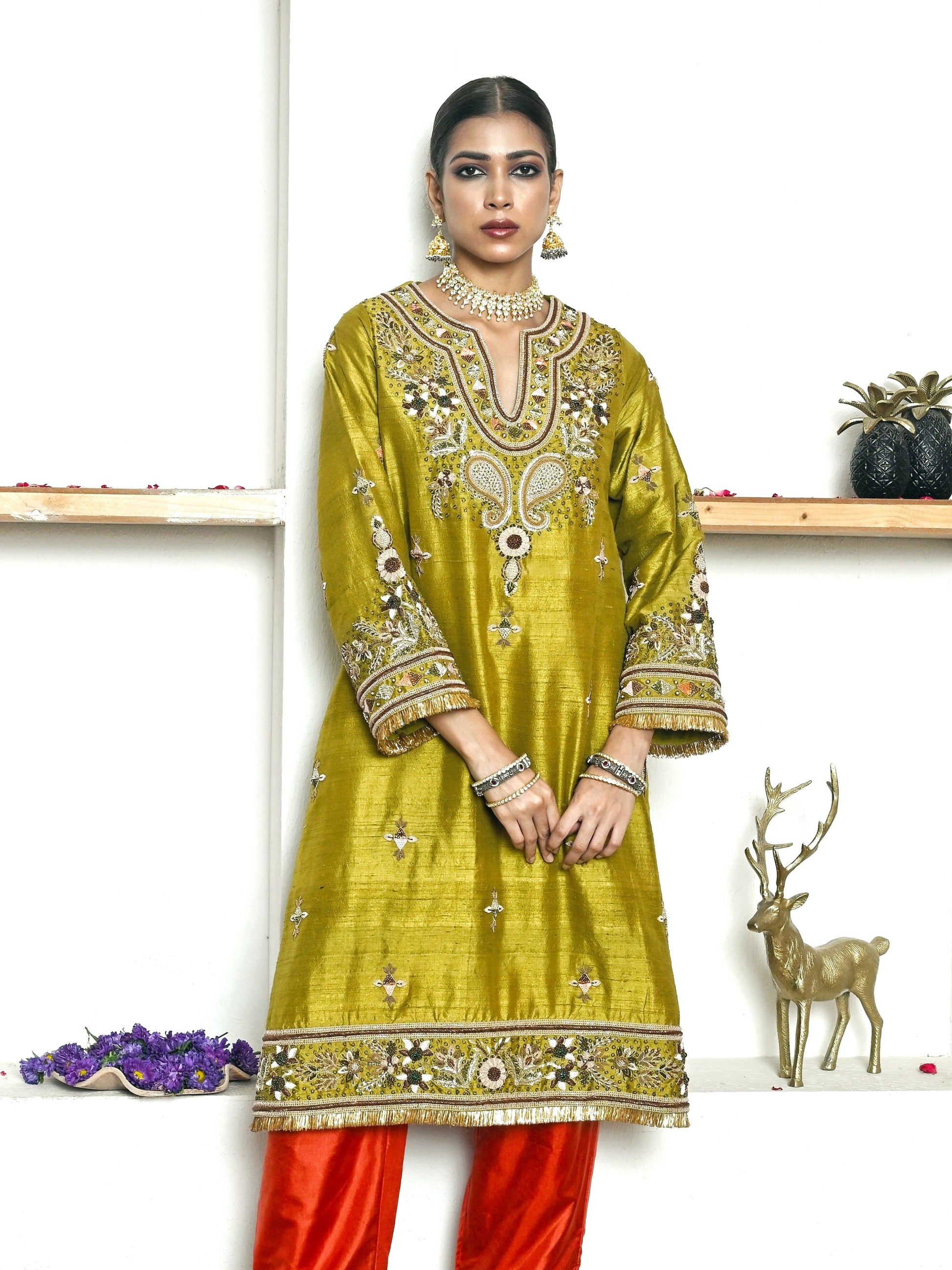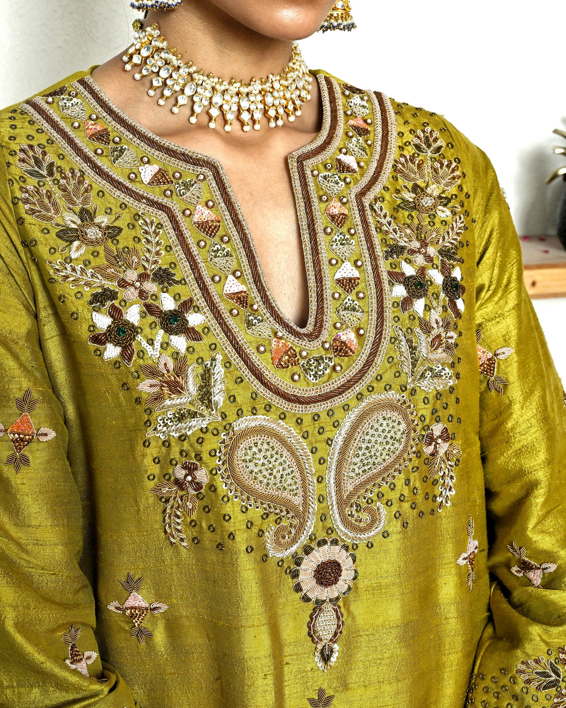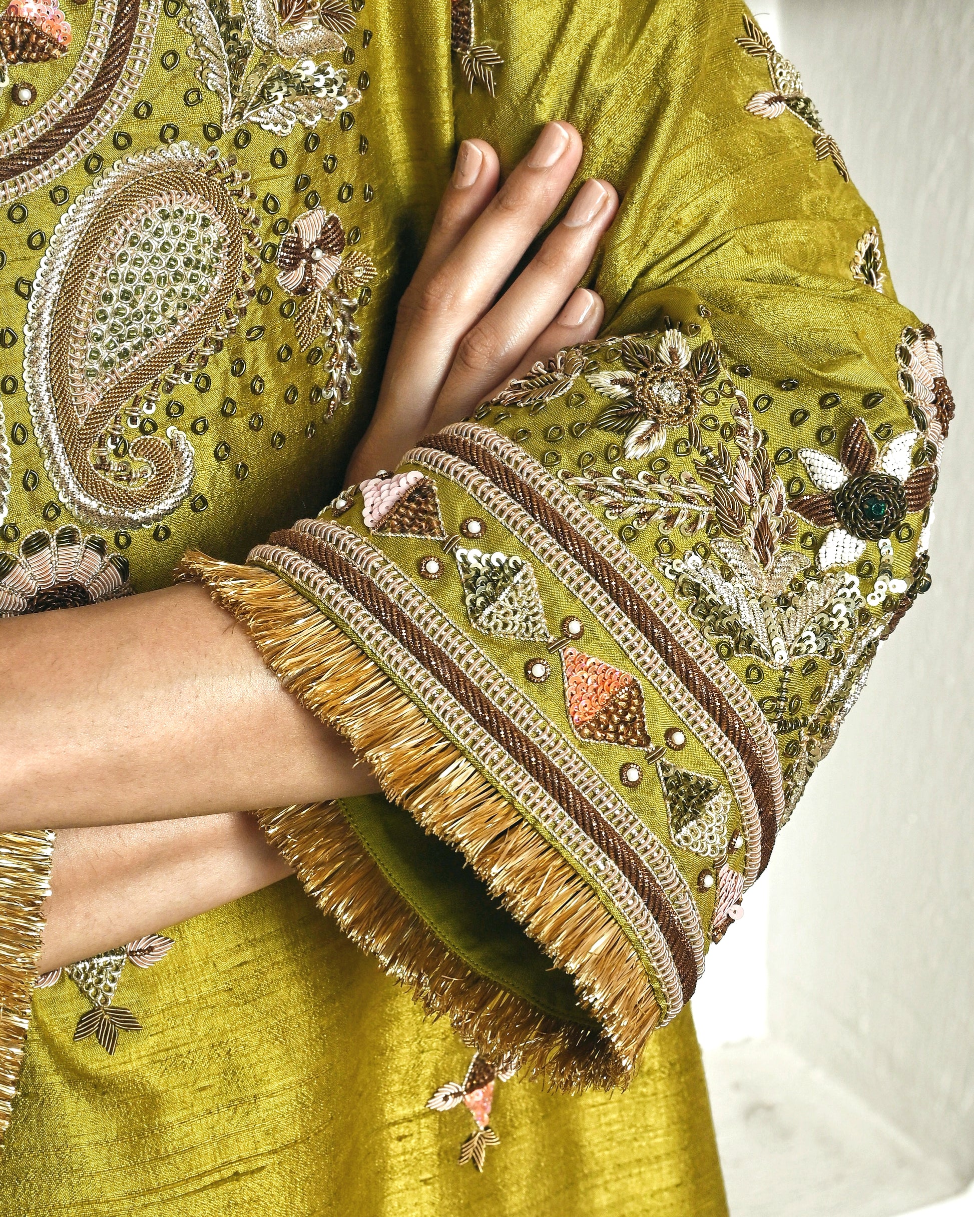 Olive gold raw silk kurta adorned with zardozi work in dabka, nakshi, zari, resham, beads and sequins, in hues of gold, silver, bronze with hints of orange, pink, maroon and ivory threads. Paired with a rust-orange lower, detailed with zari lace, beadwork and lappa gota — a harmony of regal craft and festive grace.