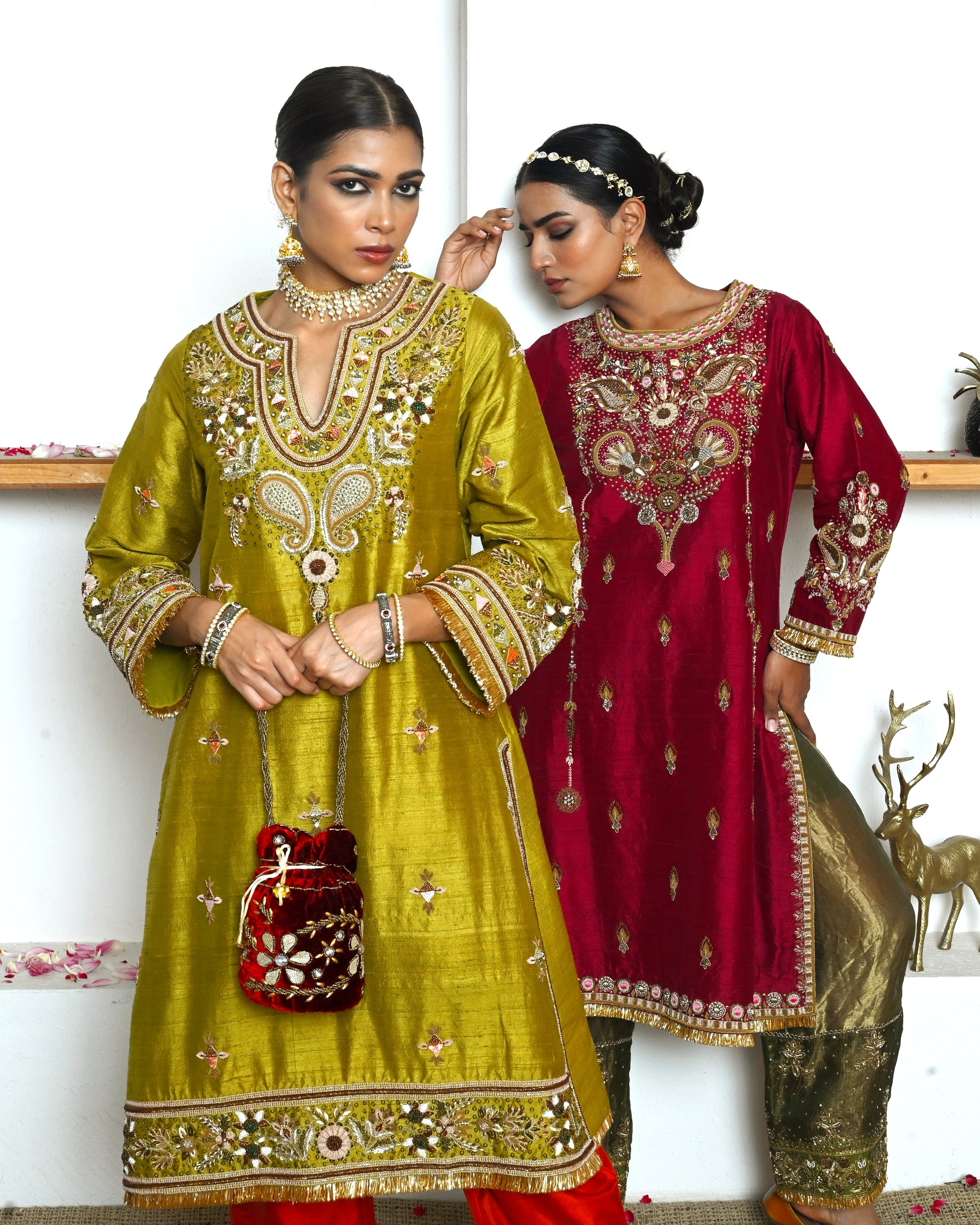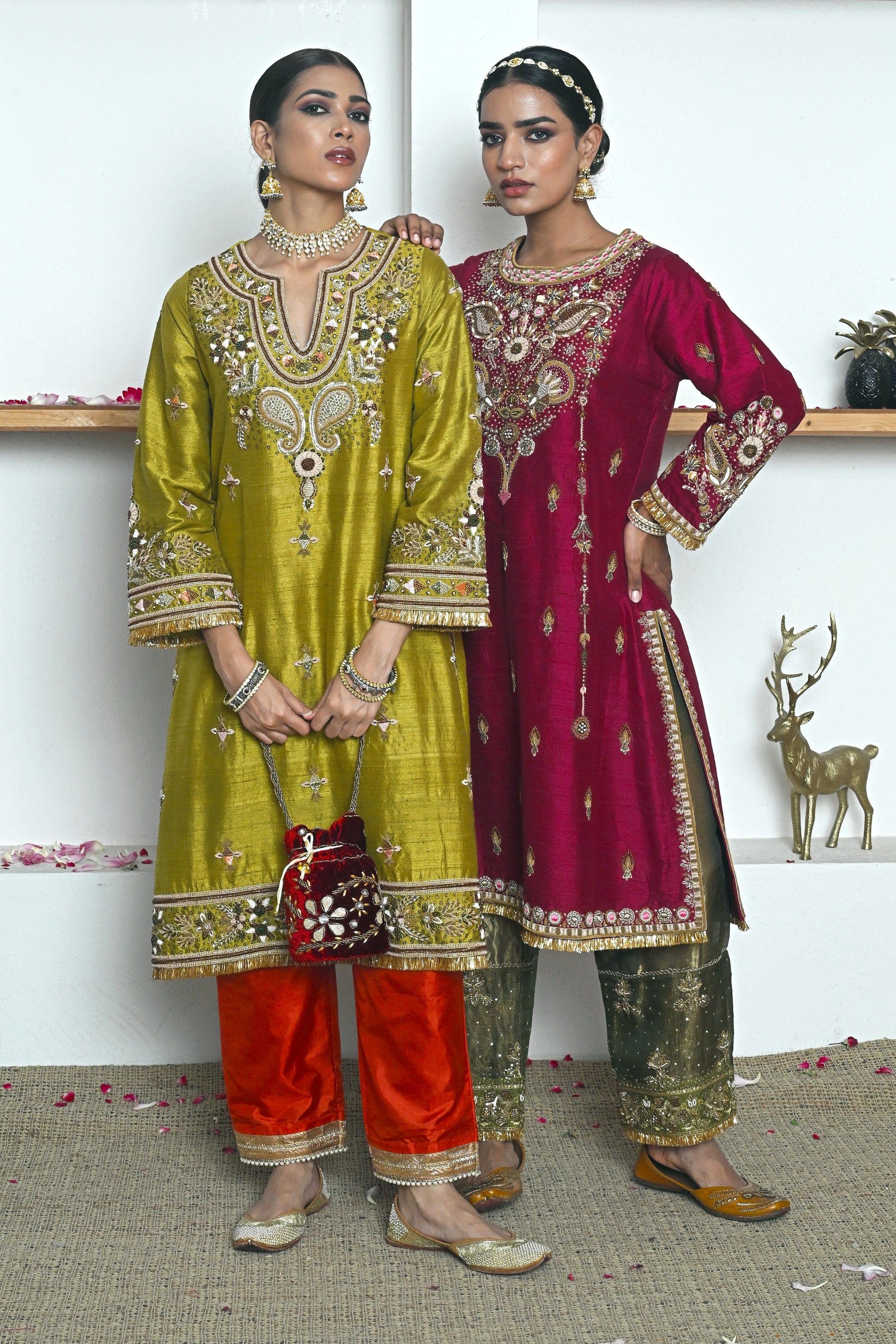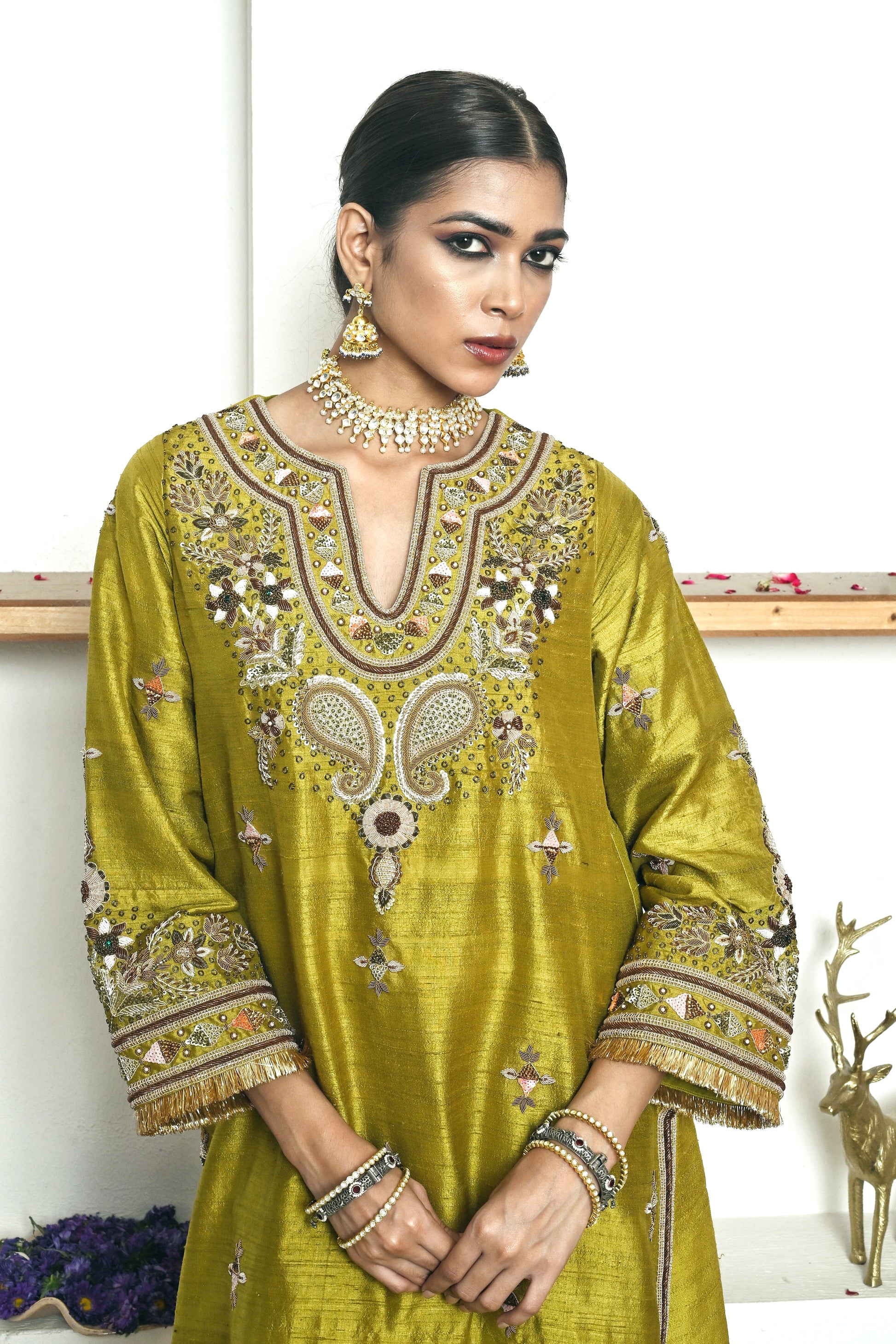 Olive gold raw silk kurta adorned with zardozi work in dabka, nakshi, zari, resham, beads and sequins, in hues of gold, silver, bronze with hints of orange, pink, maroon and ivory threads. Paired with a rust-orange lower, detailed with zari lace, beadwork and lappa gota — a harmony of regal craft and festive grace.