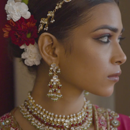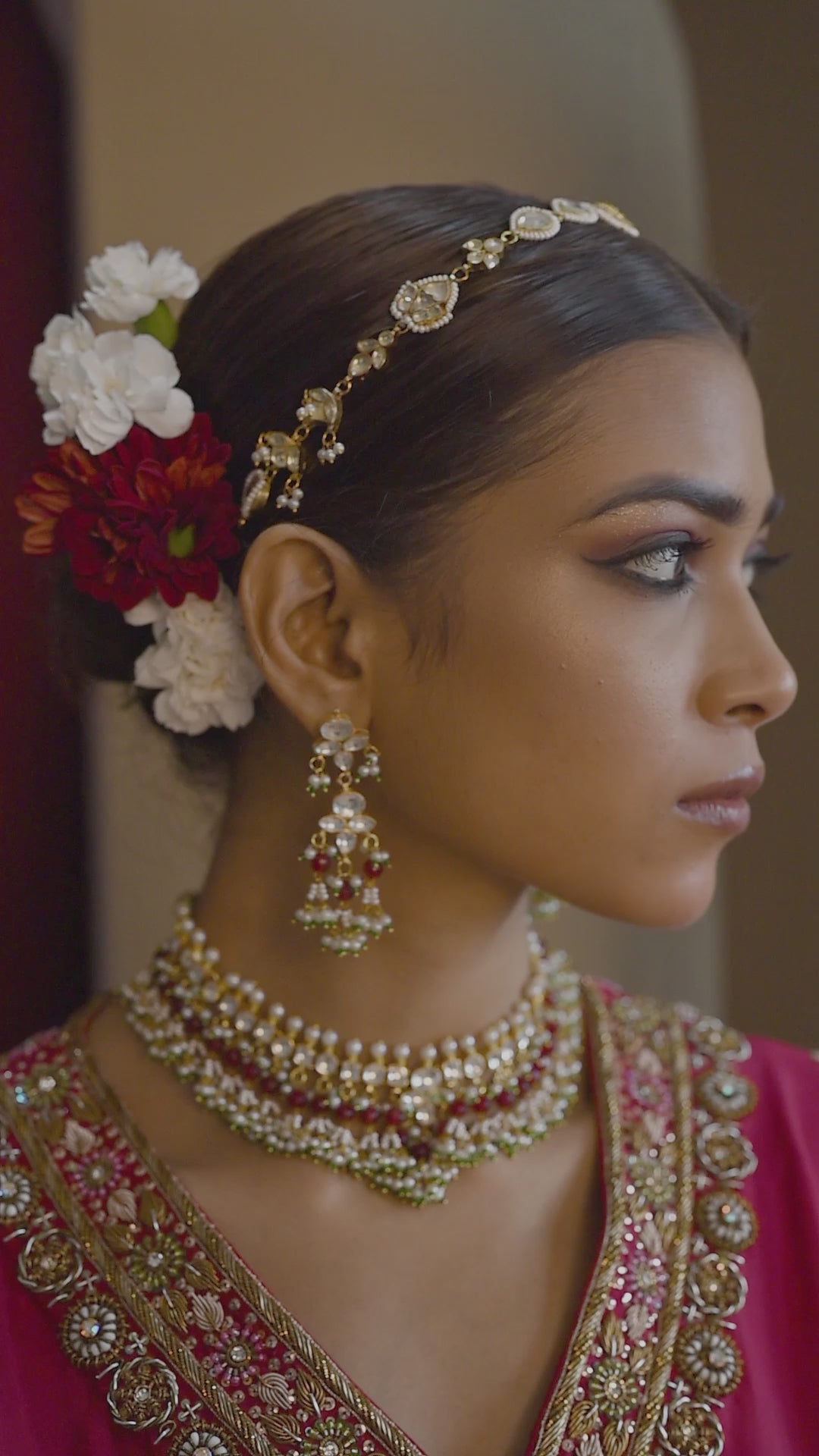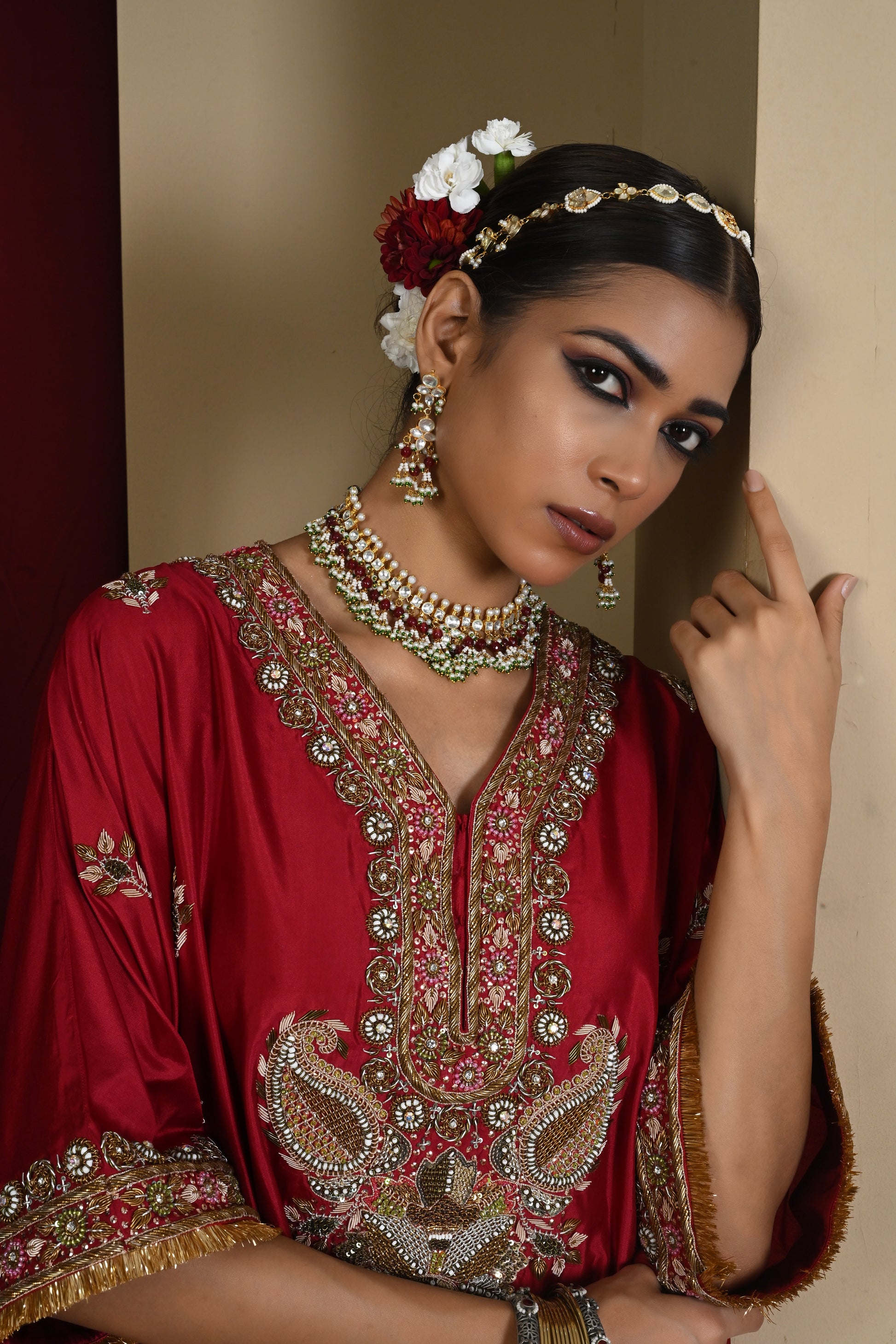 “A river of crimson dupion silk, the Mrinalini Choga blooms with the grace of a lotus. Adorned in exquisite zardozi work, its motifs shimmer like sacred petals kissed by light. Majestic yet fluid, it is a portrait of poise and divine elegance.”