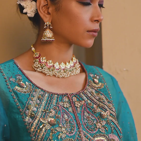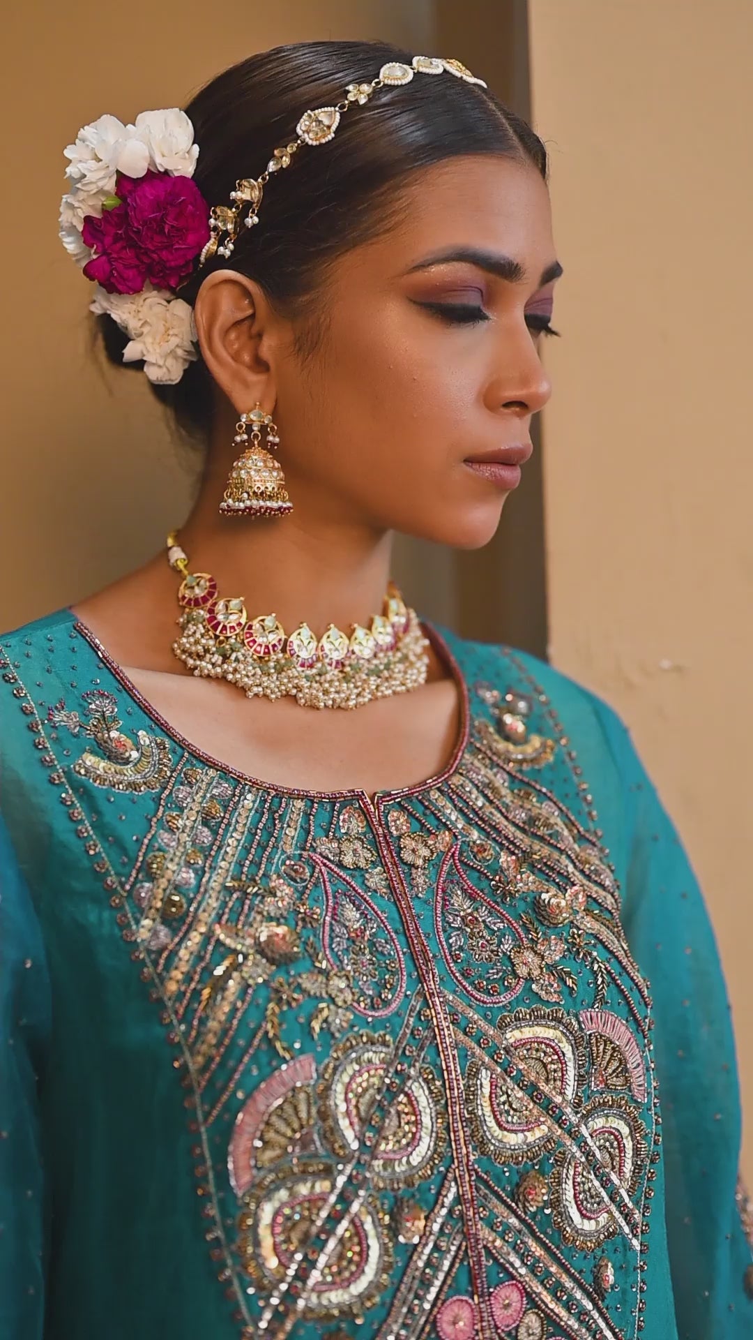 Like the bloom of a blue lotus at dawn, this turquoise silk organza kurta radiates elegance. Intricately adorned with beadwork, resham embroidery, zari threadwork, cut-dana, and sequins, it carries an ethereal charm.