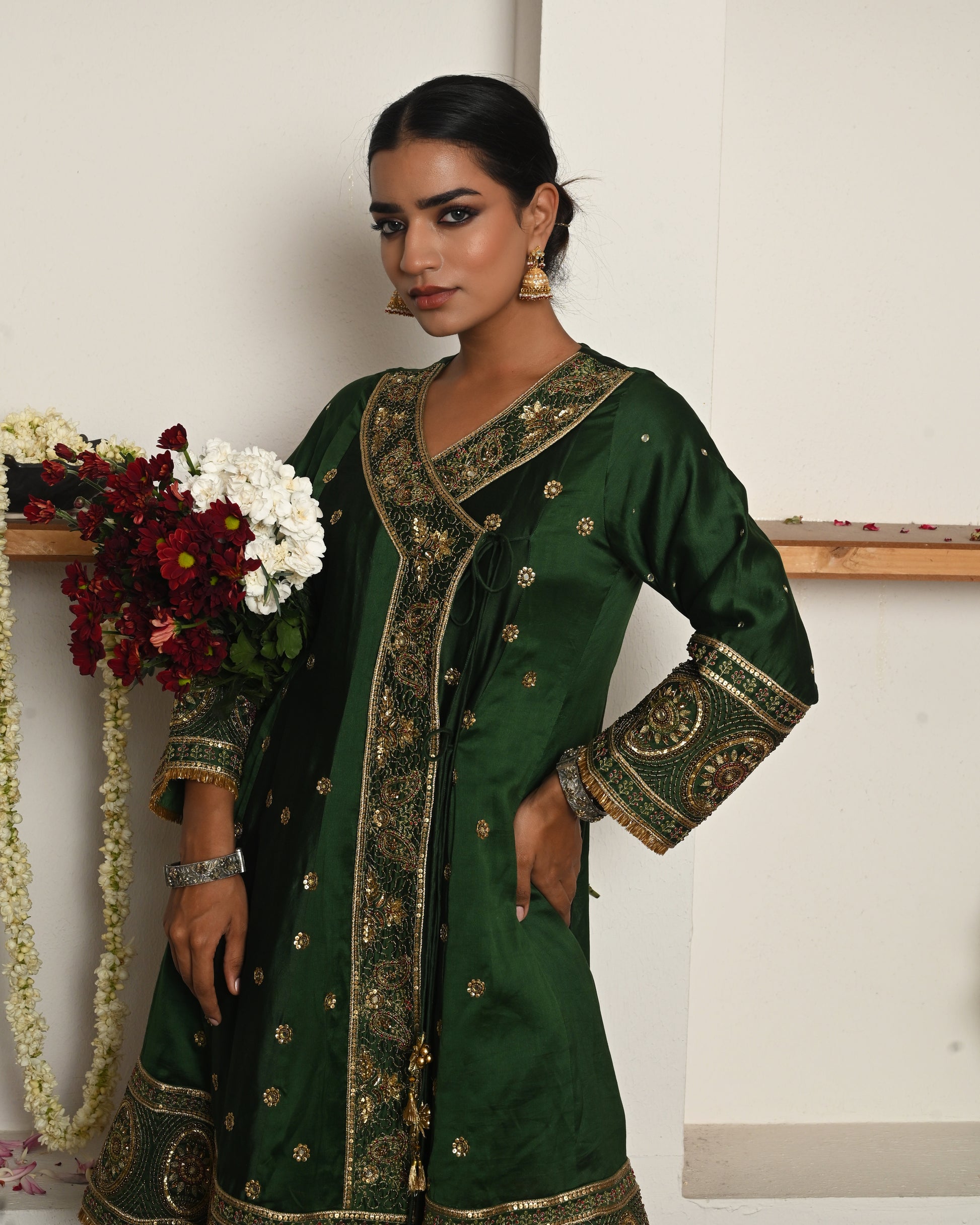 A forest green Angrakha in lustrous Chanderi silk, intricately embroidered with zari, contrast beads, sequins, and sparkling mirror accents. Zari dori work adds refined depth, while the sleeve and hem are delicately finished with kinari lace. Paired with a contrasting Chanderi silk pant adorned with matching embroidery, this ensemble radiates timeless elegance and festive charm.