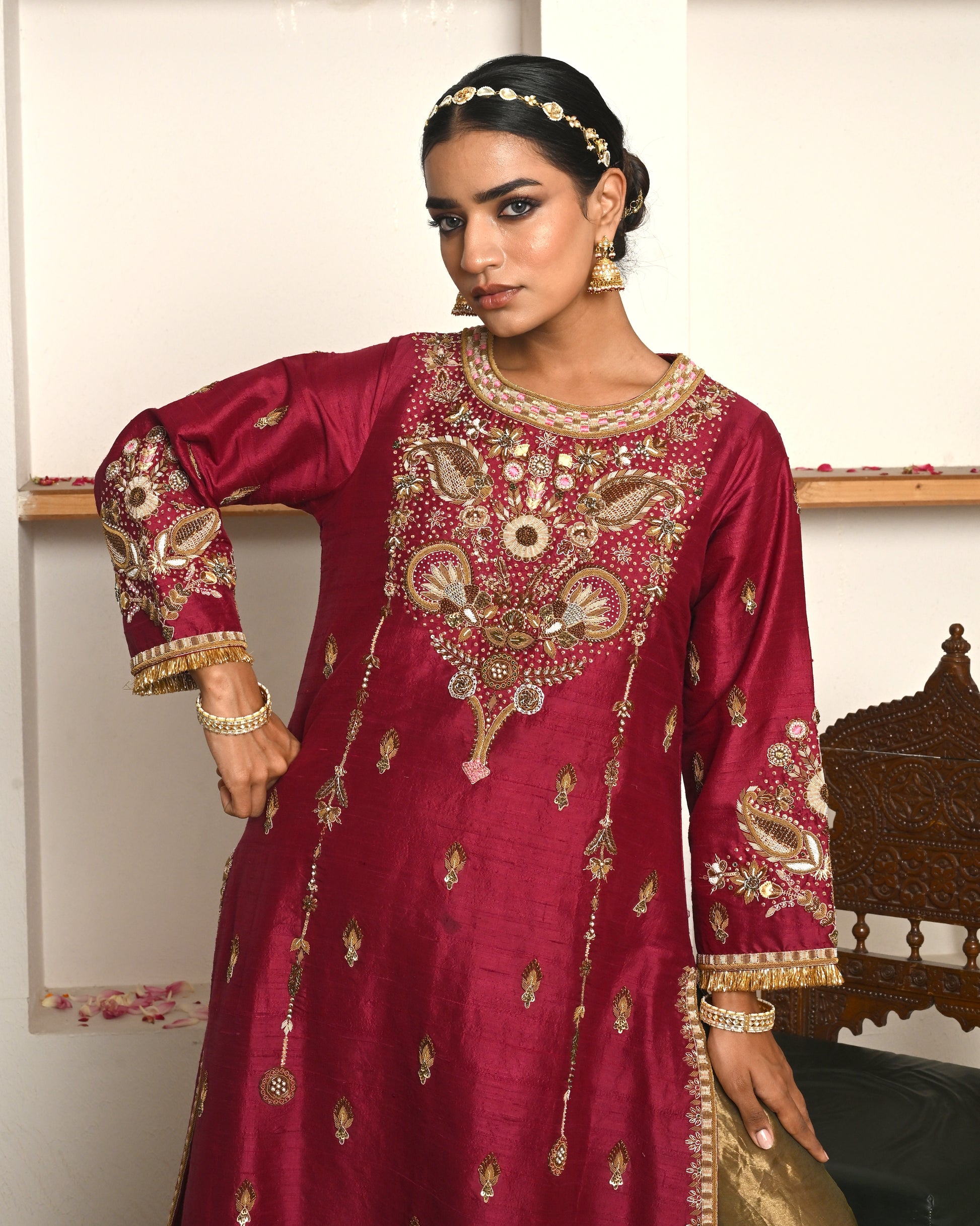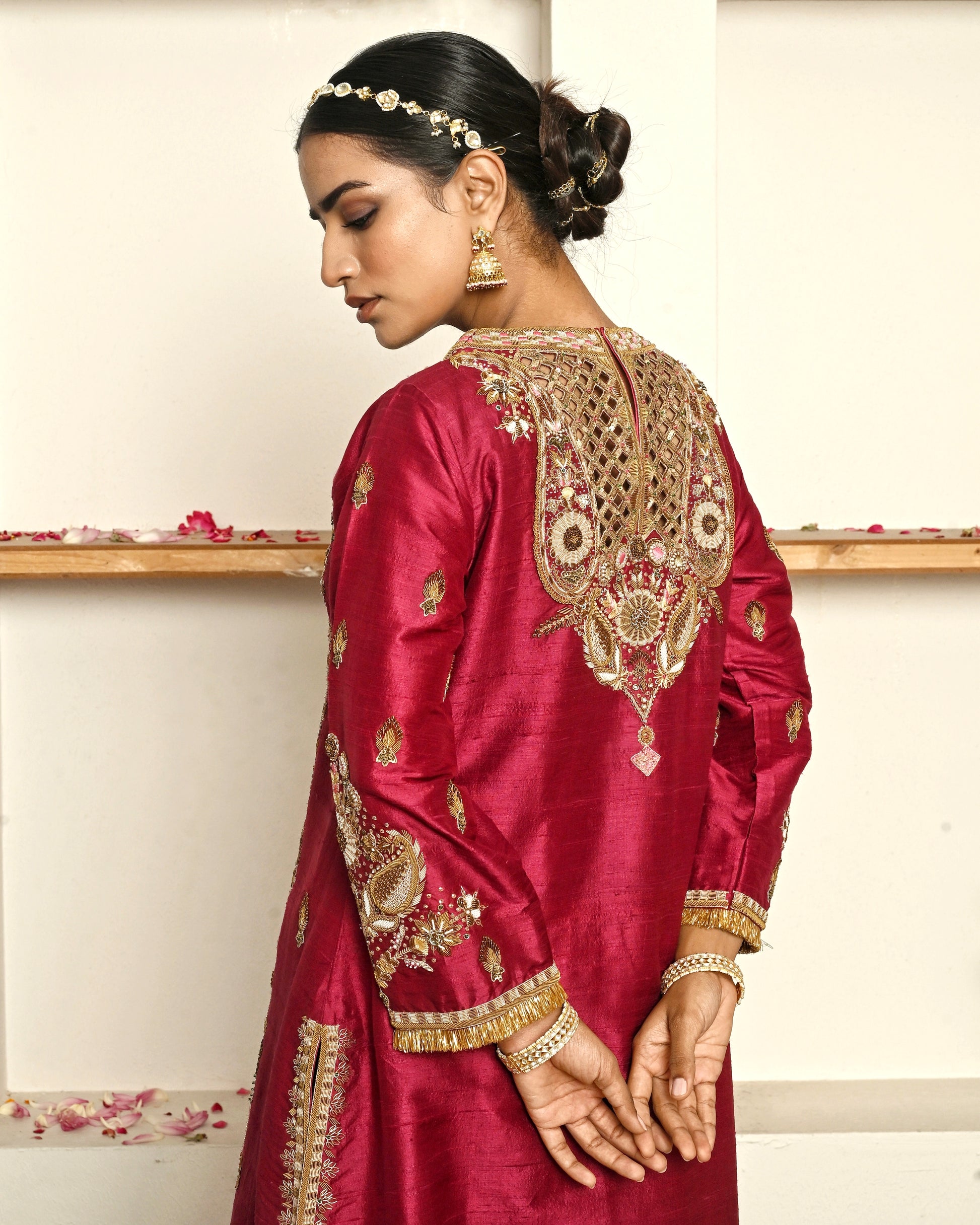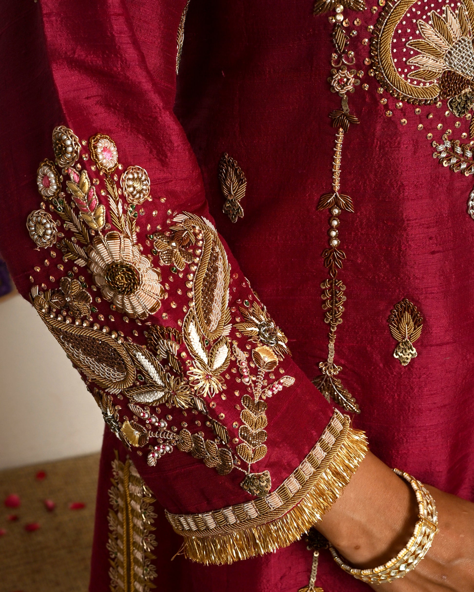 Tarunima Kurta Set in raw silk is a canvas of florals and paisleys, hand-embroidered with dabka, nakshi, resham, sequins and beads. While the neckline, sleeves and panels glisten in timeless zardozi, it is the back that captivates - a breathtaking cutwork design, intricately detailed with zardozi, turning every exit into a statement. Paired with a tissue silk lower and dupatta, kissed with zari and zardozi, it is elegance that lingers.