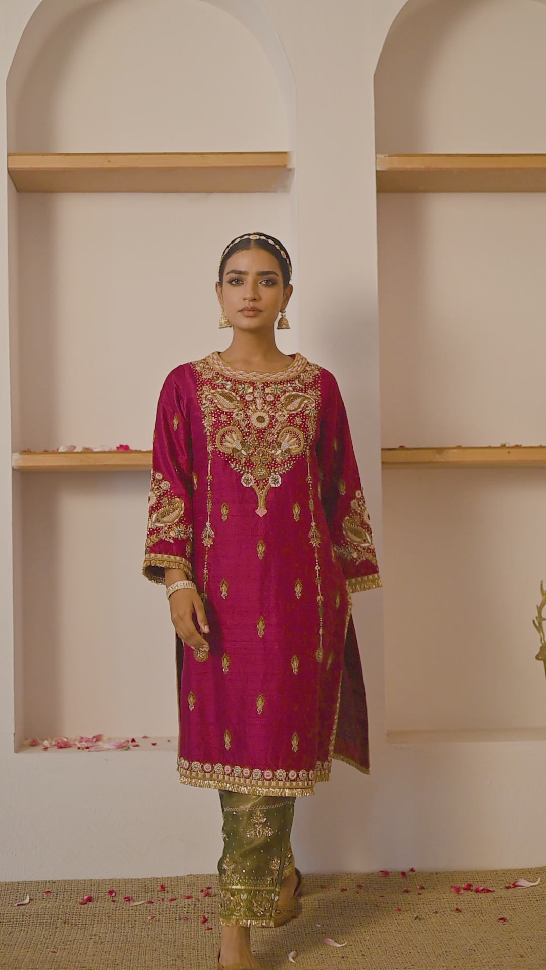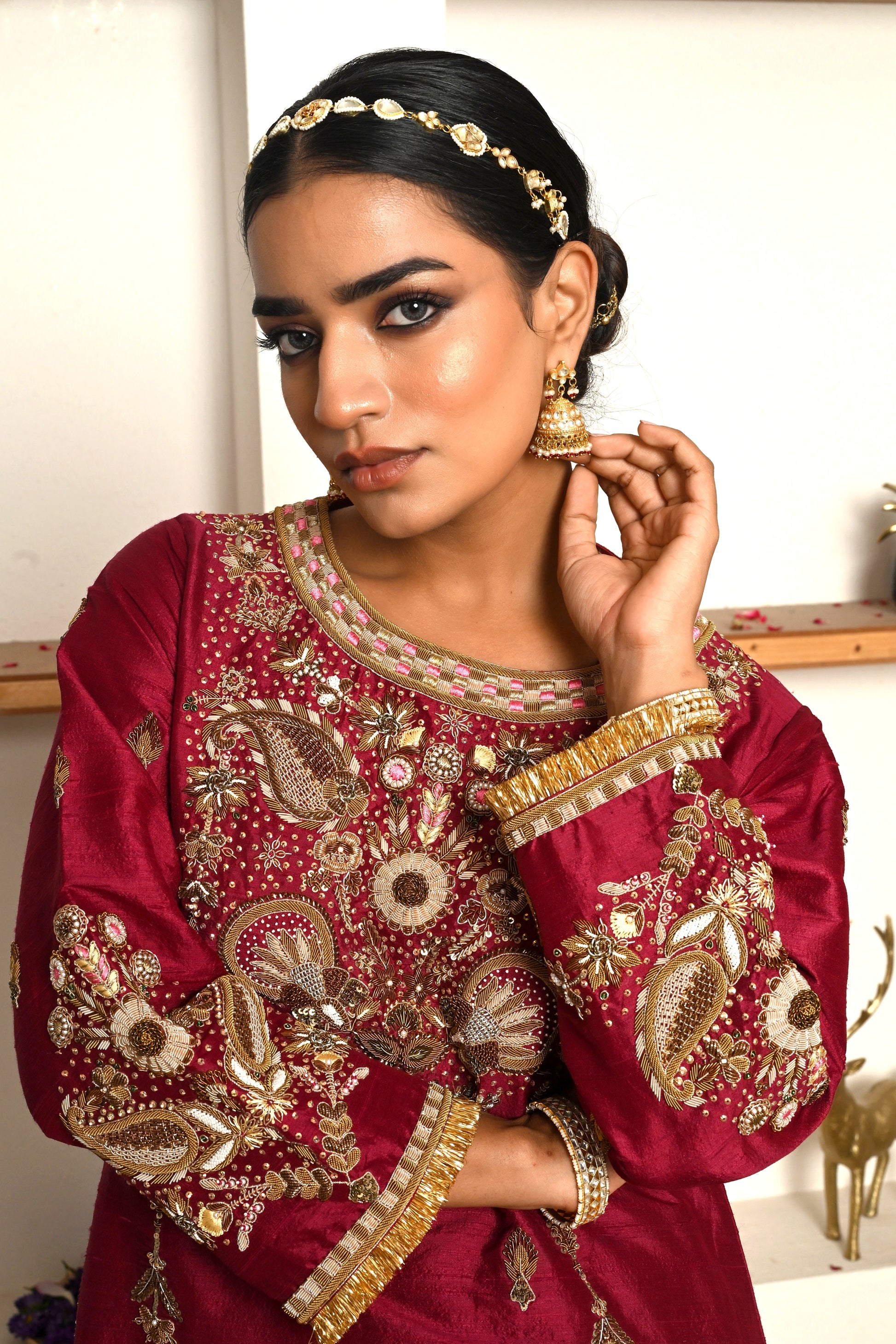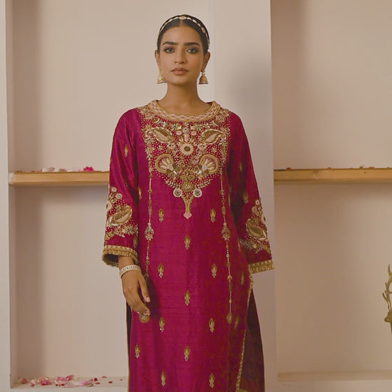 Tarunima Kurta Set in raw silk is a canvas of florals and paisleys, hand-embroidered with dabka, nakshi, resham, sequins and beads. While the neckline, sleeves and panels glisten in timeless zardozi, it is the back that captivates - a breathtaking cutwork design, intricately detailed with zardozi, turning every exit into a statement. Paired with a tissue silk lower and dupatta, kissed with zari and zardozi, it is elegance that lingers.
