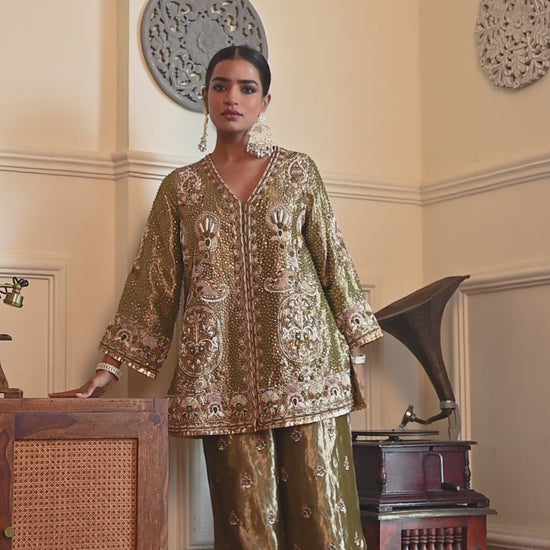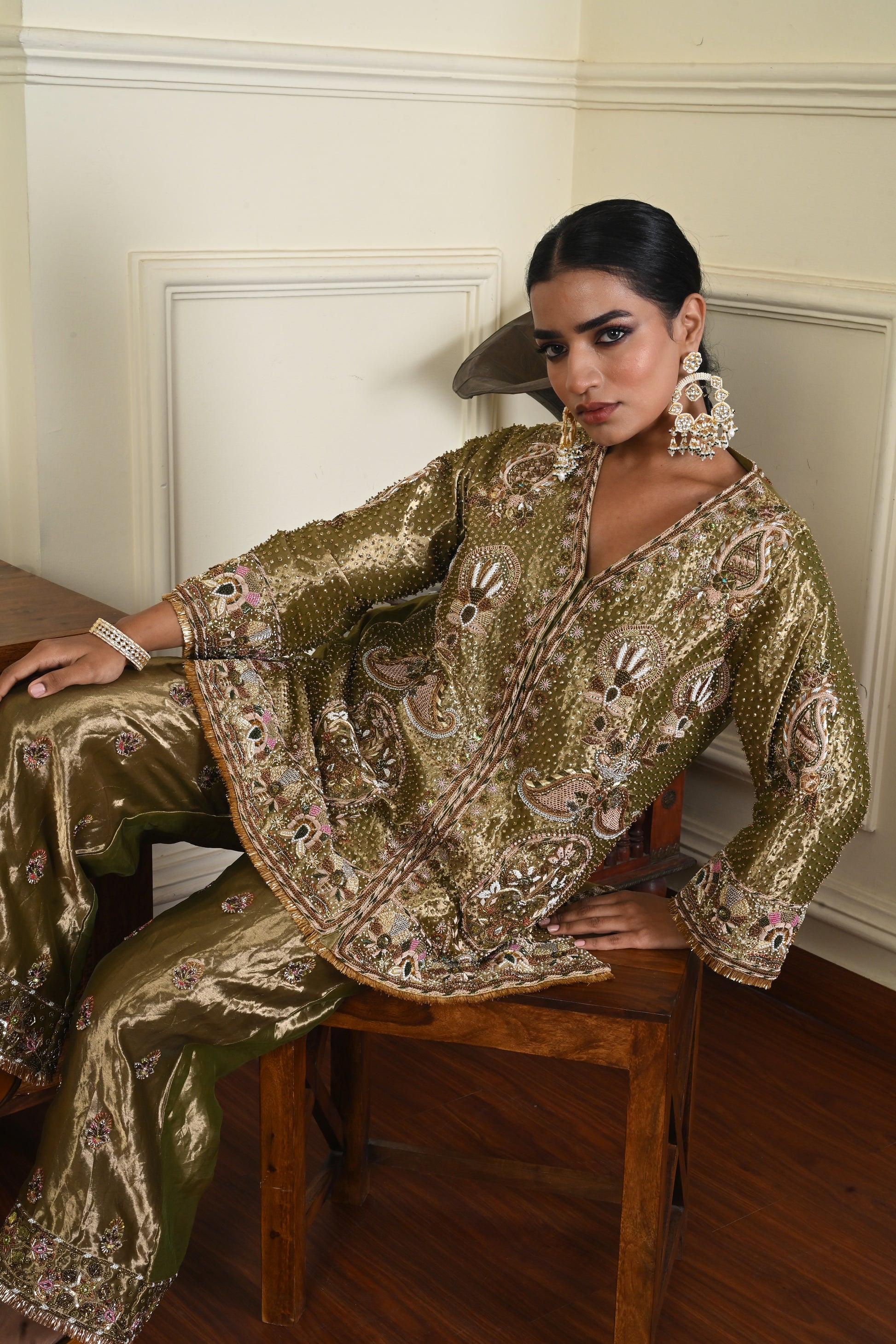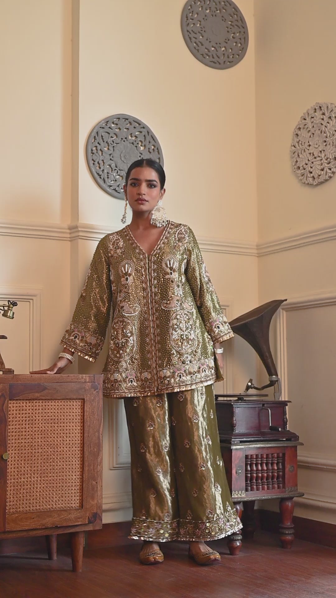 Antique gold tissue short kurta with intricate zardozi work featuring beads, sequins, mukesh, zari, and resham. Naka-tikki work adorn the kurta, with more-chhali detailing along the front opening and side slits. Paisley and floral motifs enhanced with nakshi, dabka, beads, and sequins. Paired with a matching lower with delicate embroidery and a heavily adorned hem for a cohesive, opulent look.