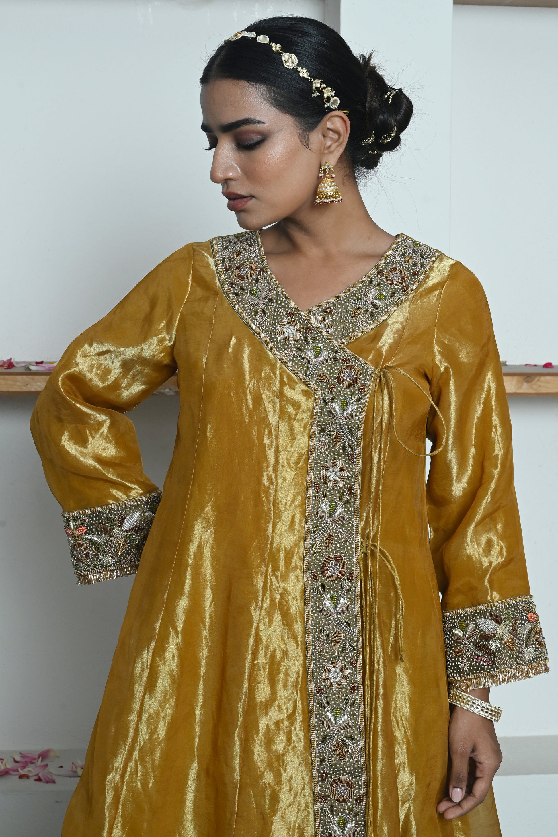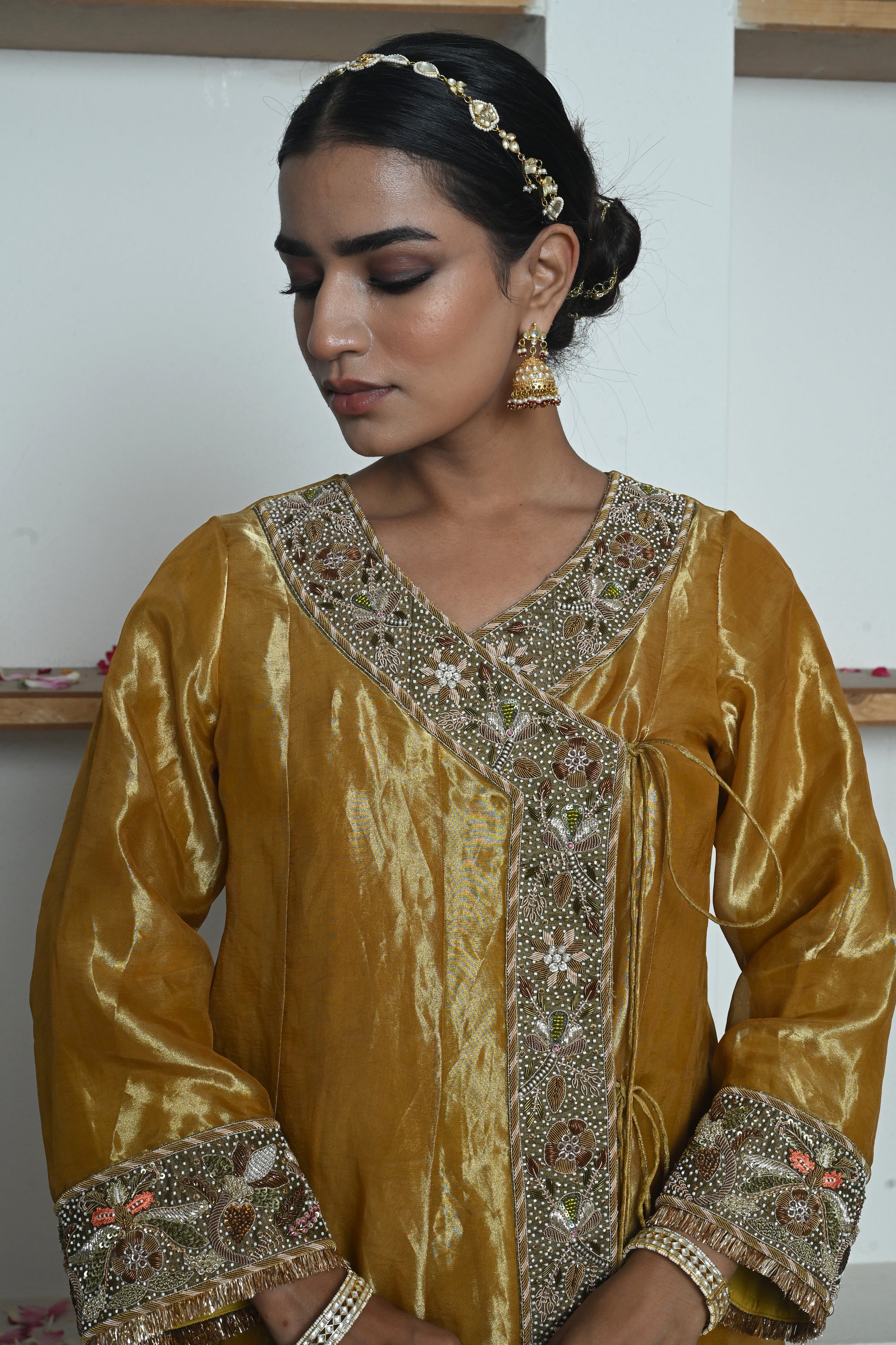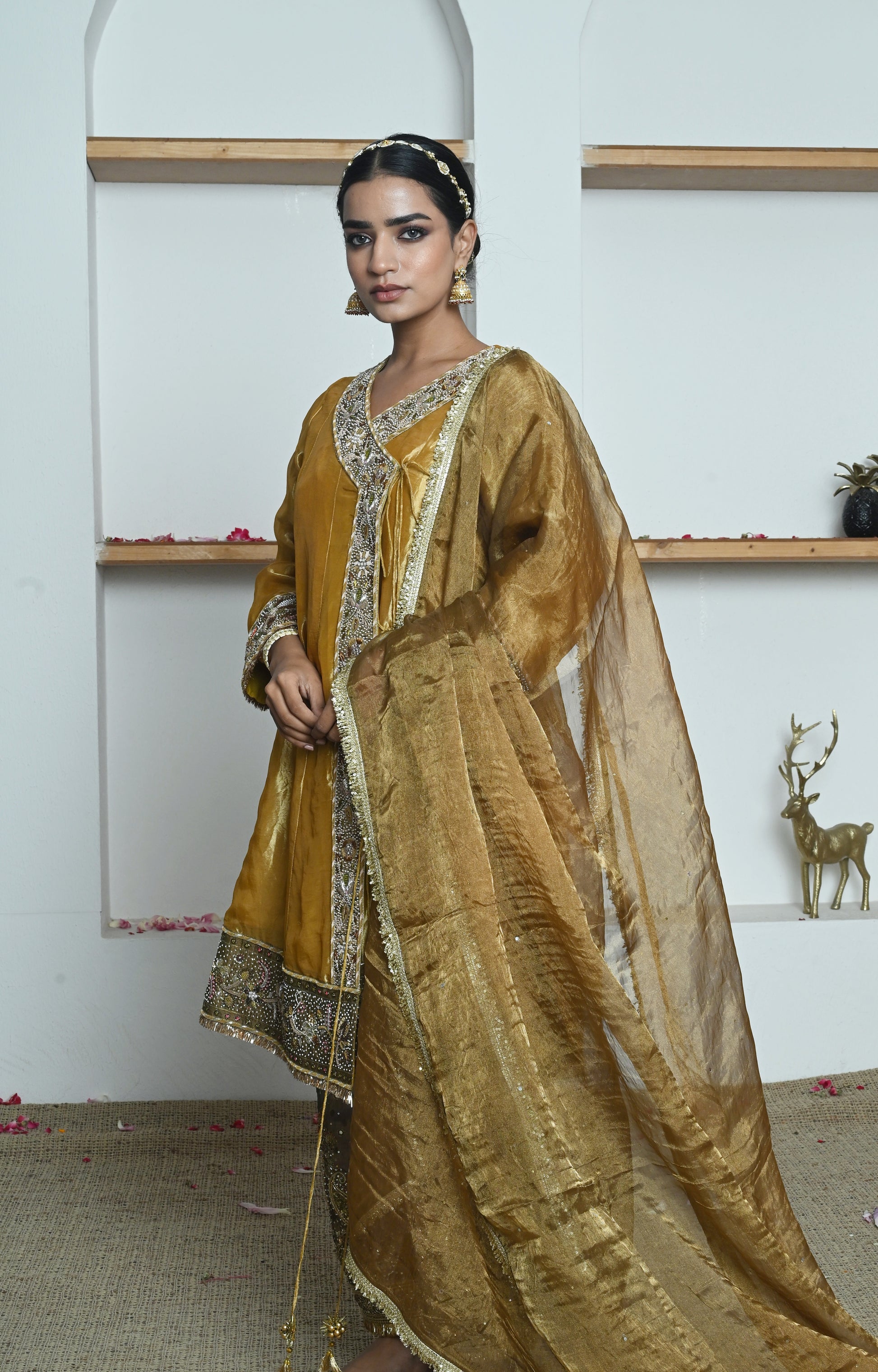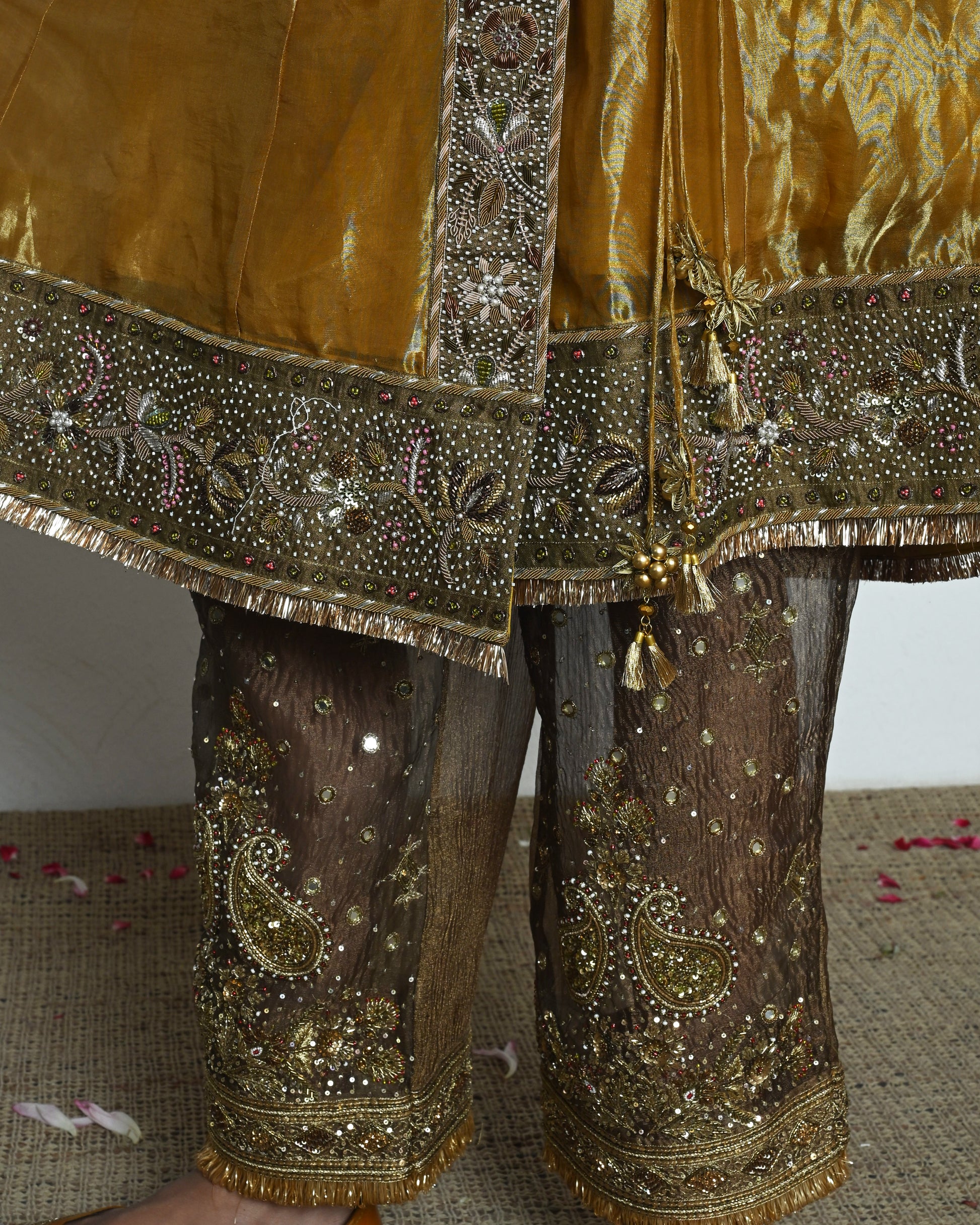 An antique gold tissue lower glimmers with mirrors and zari light,