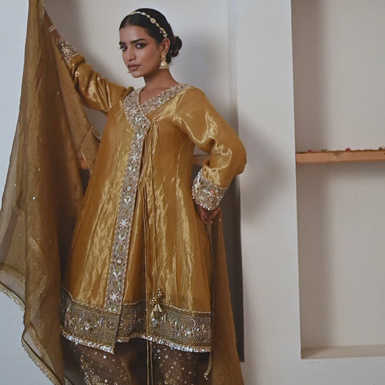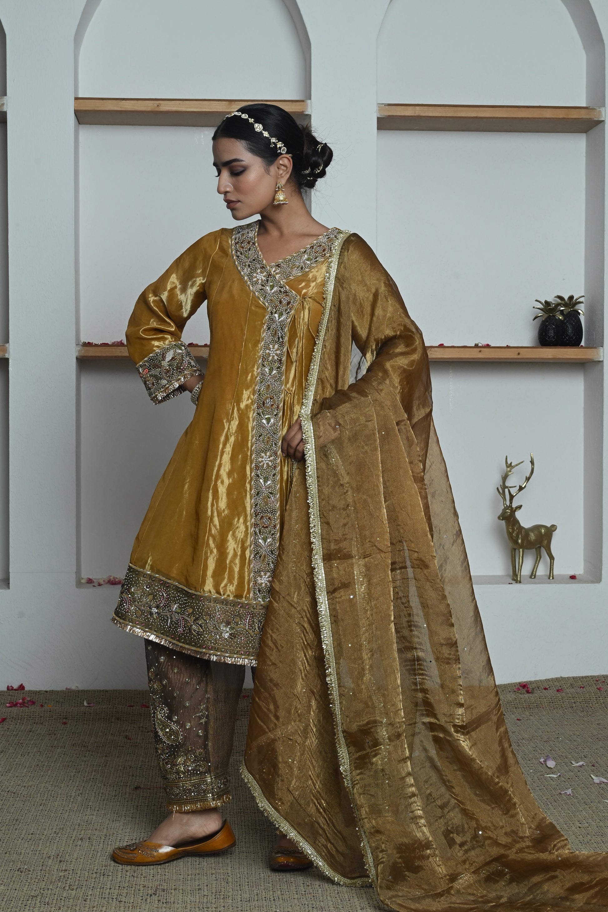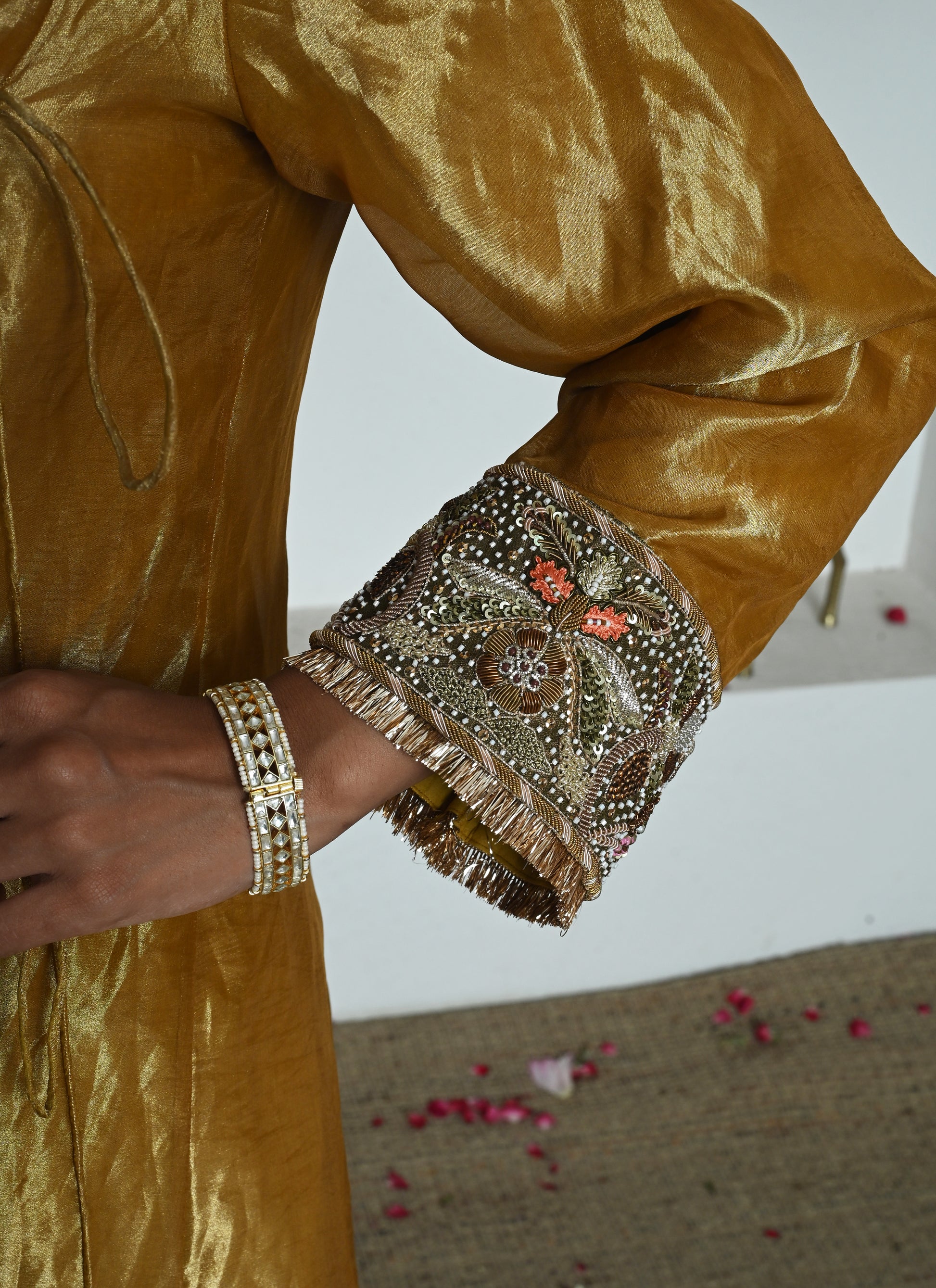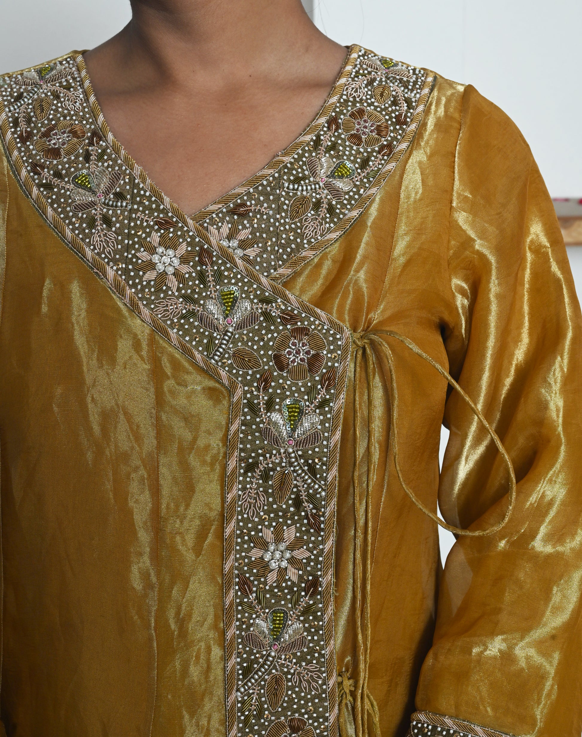 An antique gold tissue lower glimmers with mirrors and zari light,