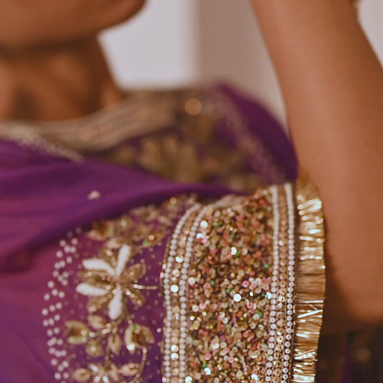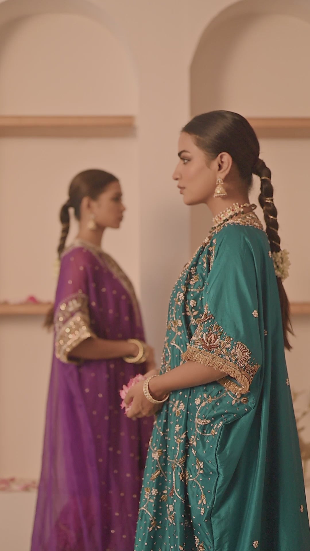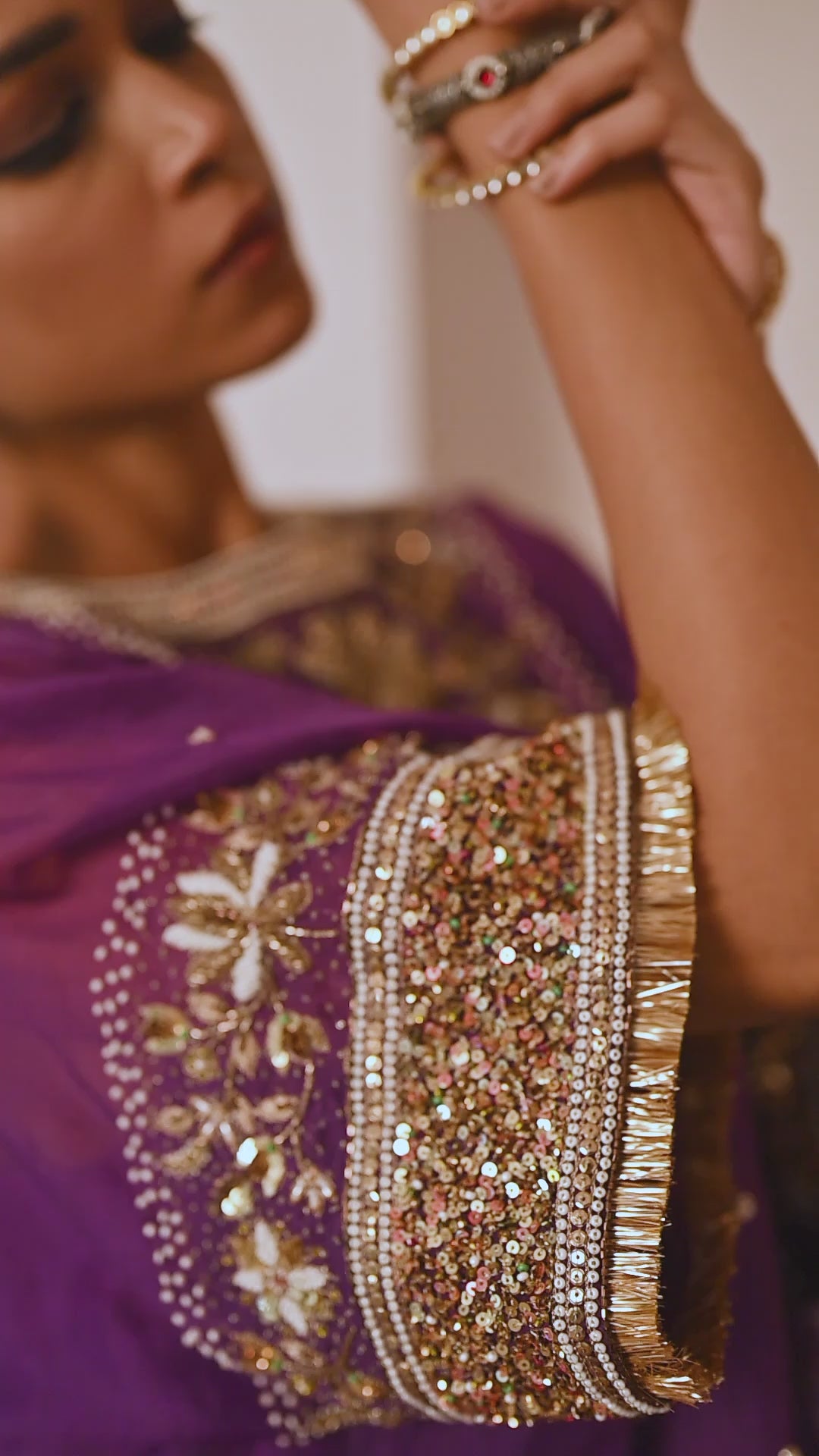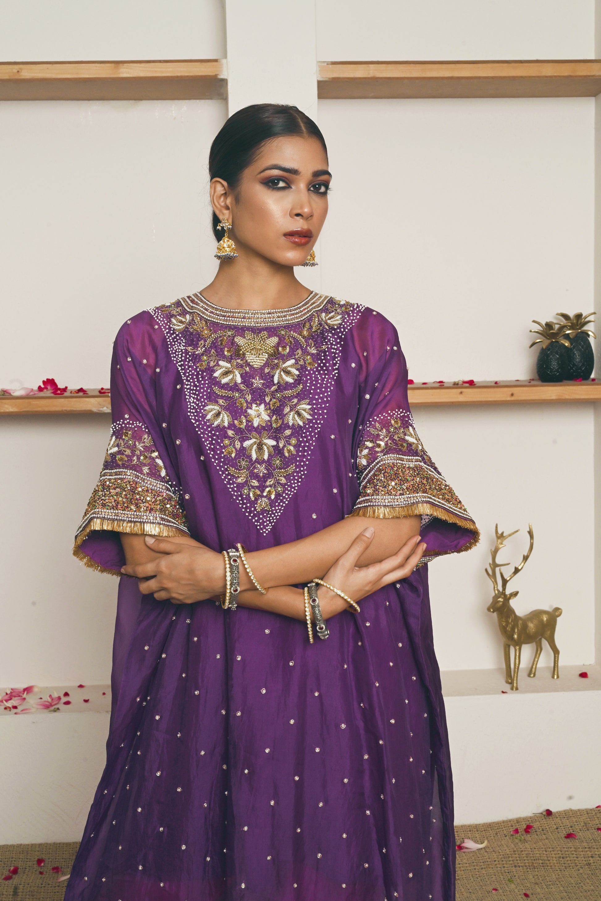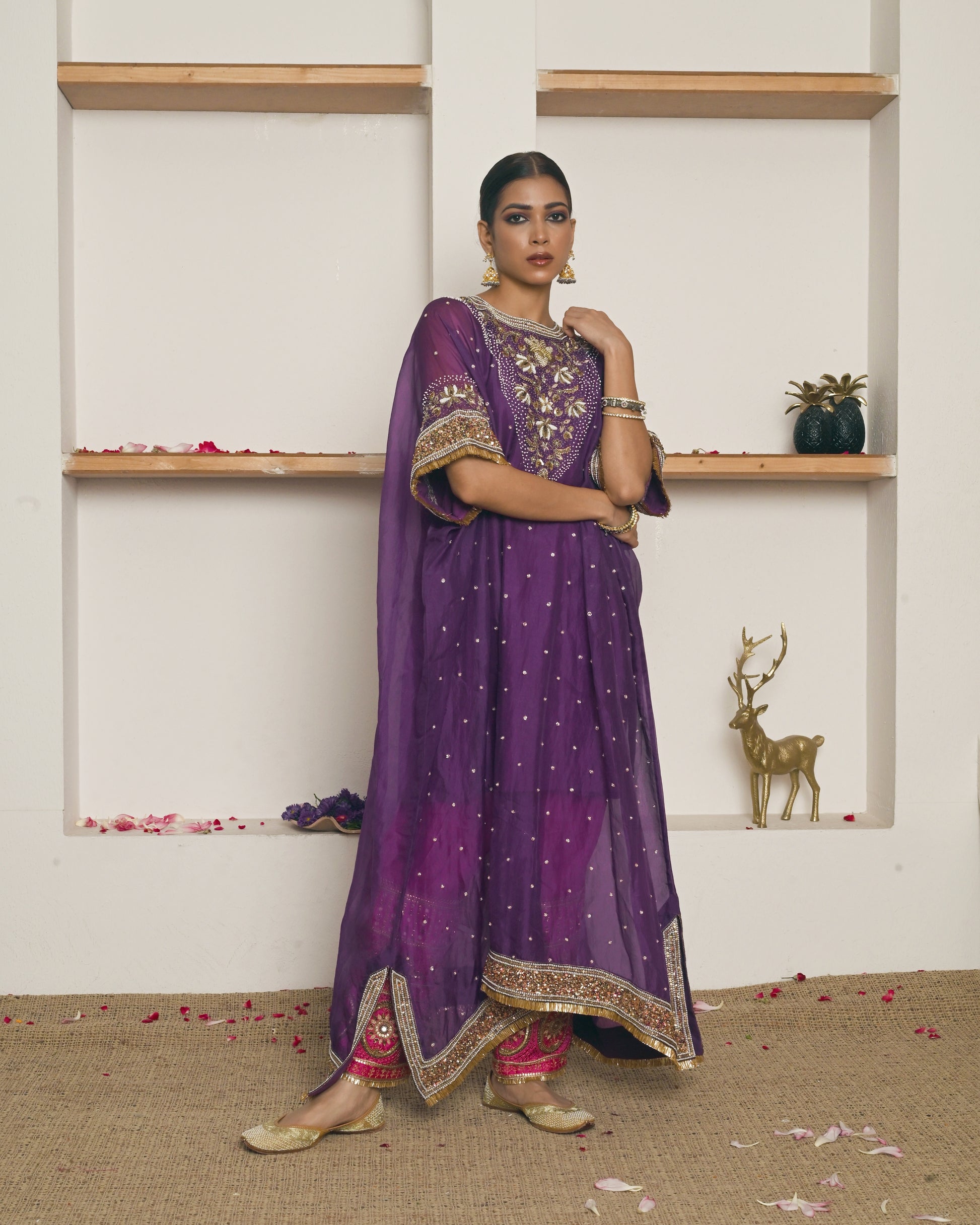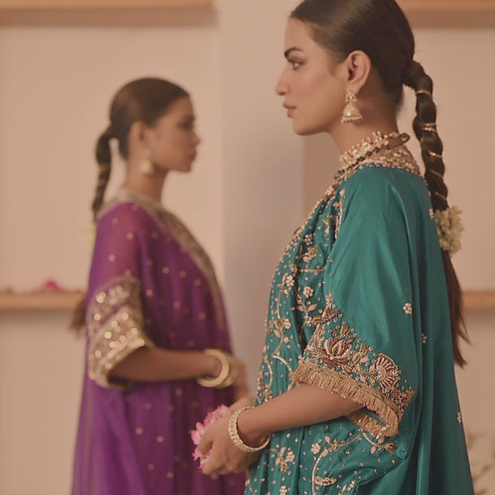 A silk organza kaftan, delicately hand-embellished with zari, beads, sequins, moti, cut-dana, nakshi, and zardozi work. Paired with a Chanderi silk lower adorned with zari, mirror, beads, and sequins – a graceful ode to the purple lotus in festive elegance.”